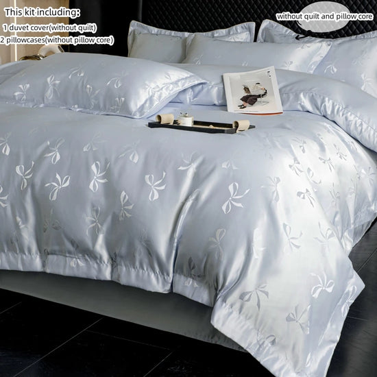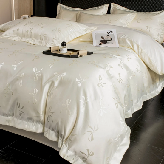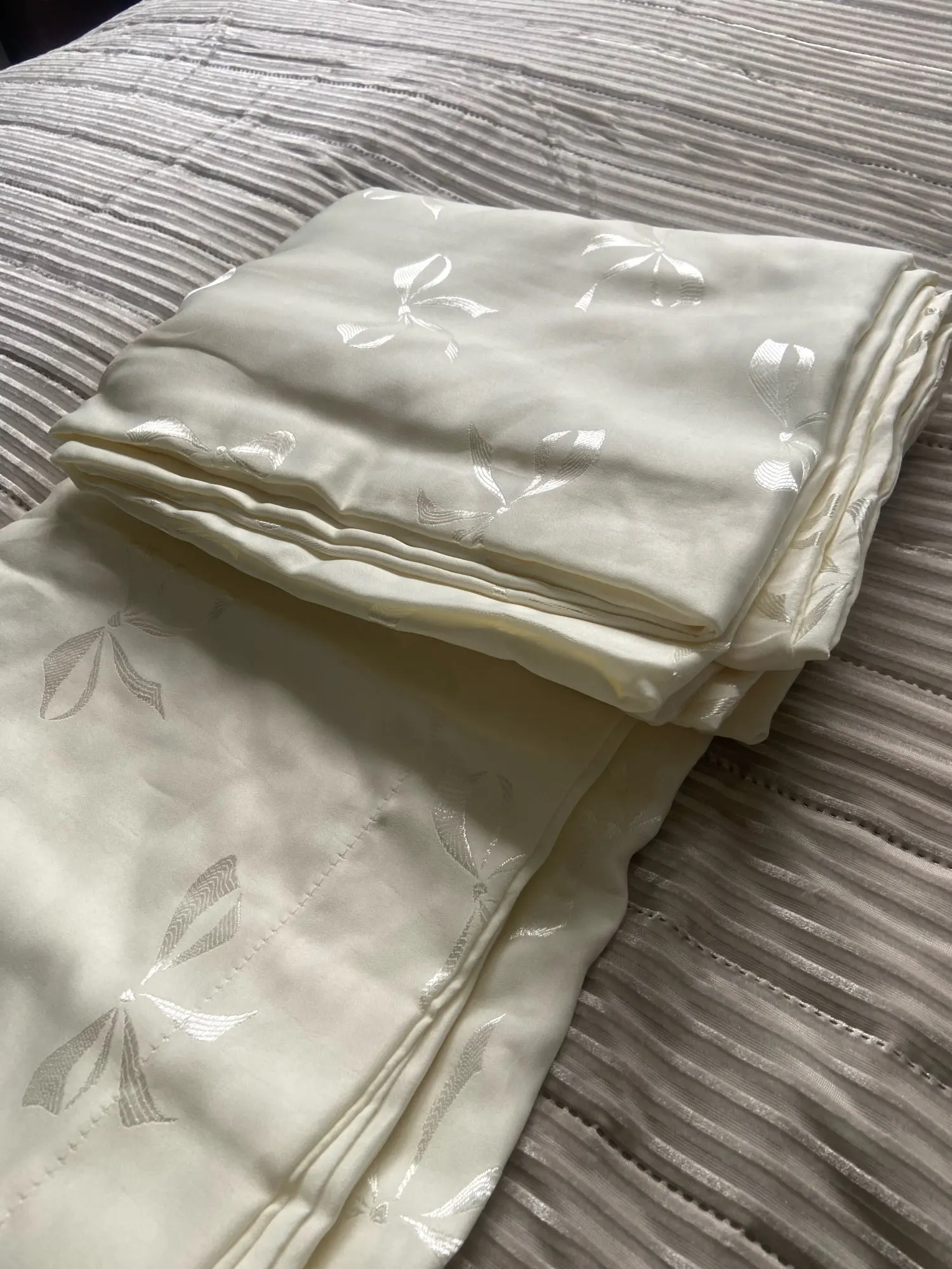 Designed with delicate embroidered bow motifs and a smooth, luminous finish, this set gives your bed a refined, feminine glow that feels effortlessly aesthetic ✧