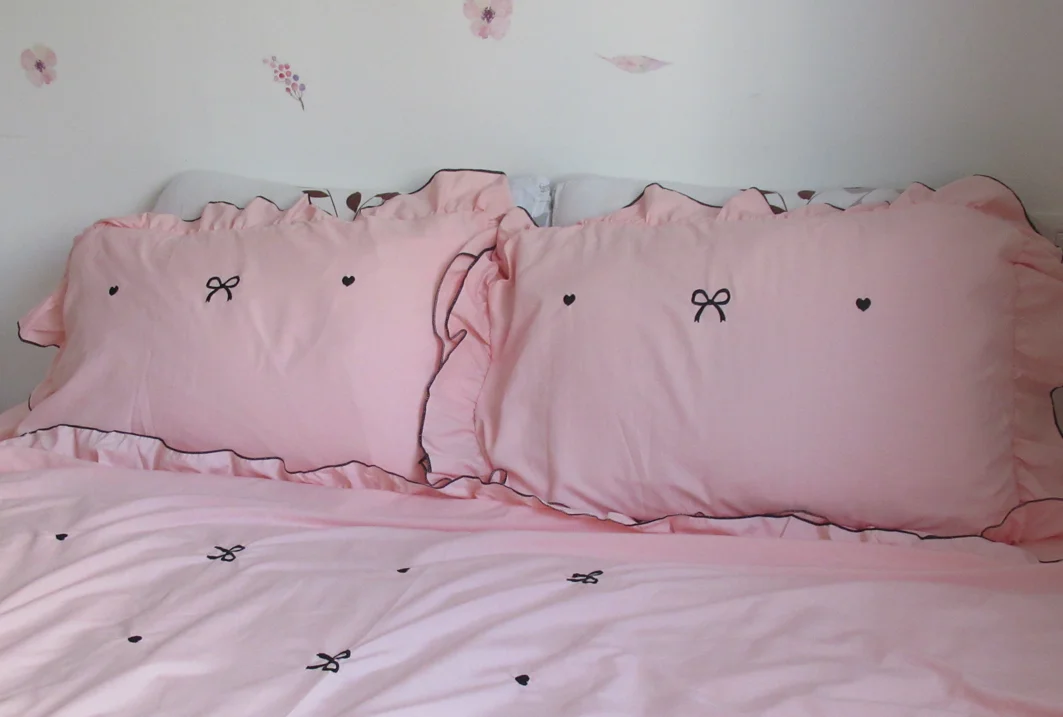 The lightweight fabric drapes smoothly across the bed, while subtle ruffle edges and scattered mini bows add just the right amount of charm.