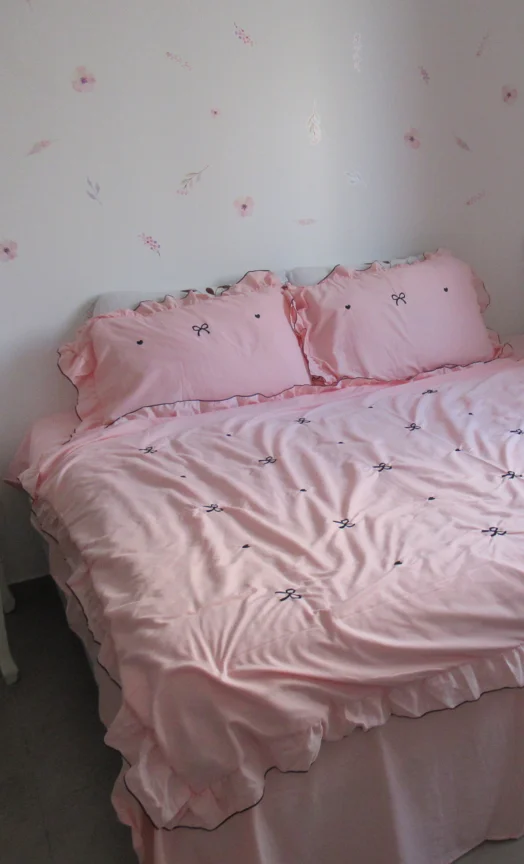 Each bow is placed thoughtfully, giving the set a refined, decorative look rather than a loud pattern. The ruffled trim frames the bedding beautifully, creating a soft, layered silhouette that looks styled even when casually arranged ✨